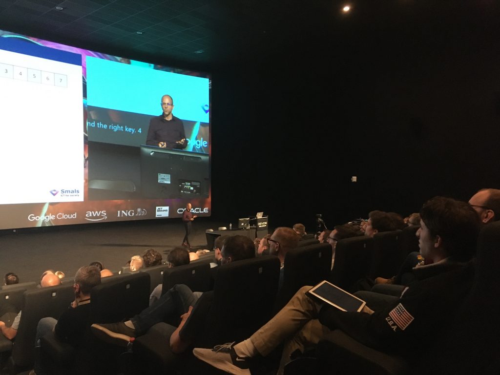 Foto gepubliceerd door Devoxx Belgium onder creative Commons. De foto (bovenaan) uit de zaal werd genomen door collega Wouter Roose.