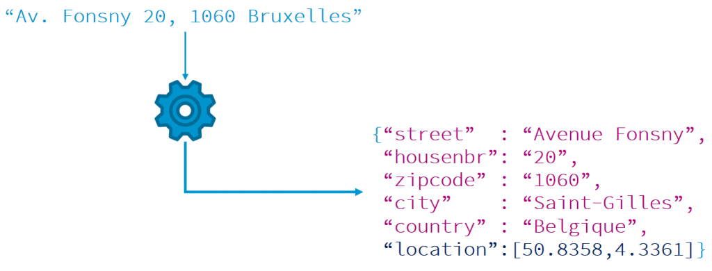 La standardisation va permettre une découpe correcte de l’adresse en composants, et une rectification (“Av.” en “Avenue”, “1060 Bruxelles” en “1060 Saint-Gilles”). Elle pourra aussi supprimer des éléments non pertinents pour le géocodage, comme par exemple la partie en italique grisée dans “Av. Fonsny 20 bte 5 (en face de la gare)“. Cette étape revient en fait à faire la correspondance entre une adresse en entrée et le référentiel dans lequel chaque adresse structurée est associée à ses coordonnées géographiques. Cette étape de standardisation fait donc intégralement partie du processus de géocodage et est nécessaire.