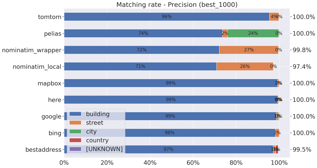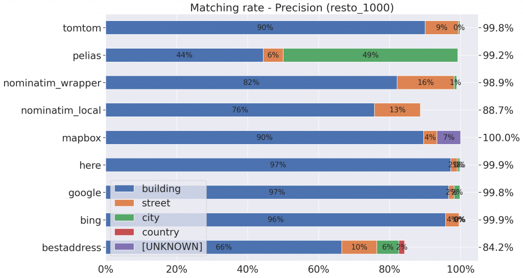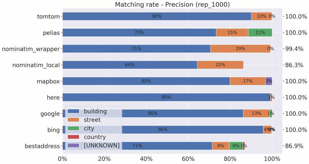 - Nominatim n’est pas très robuste : en fonction du jeu de données, mises à part sur les données de BestAddress (best_1000, nettement plus propres et standardisées que les autres jeux de données), entre 10 et 15 % des adresses n’ont tout simplement pas été trouvées. Et pour une proportion importante des adresses, seule la rue est connue ;