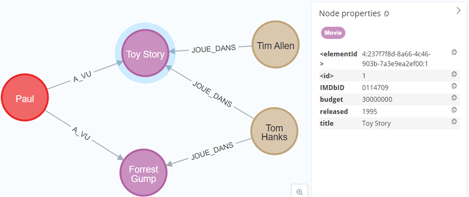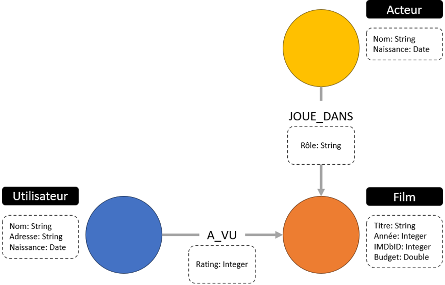 Les trois composants de toute base de données orientée graphe sont : nœuds, arcs et propriétés. Ces propriétés peuvent être placées soit sur les nœuds, soit sur les arcs, ou sur les deux. Si nous considérons le petit exemple illustratif dans la Figure 1, le nœud « Paul » peut par exemple être associé à des propriétés telles que sa date de naissance et son adresse, pour les nœuds représentant des films on peut y associer les propriétés telles que l’année de sortie, le budget et son identifiant IMDb, et sur les relations « A_VU » entre un utilisateur et un film, on pourrait associer des propriétés telles que la date de visionnage et la note (sur 5) que l’utilisateur donne au film.