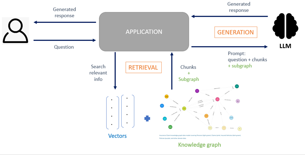 La première étape de l’opération de récupération consiste à trouver les points d’entrée dans le graphe. Soit une recherche par similarité sémantique est effectuée sur la représentation vectorielle d’un chunk ou d’un nœud, soit une requête déclarative est générée dans le langage du graphe (Cypher pour Neo4j) à partir de la requête utilisateur formulée en langage naturel. Les informations retournées par la recherche sont alors envoyées au LLM pour générer la réponse finale.