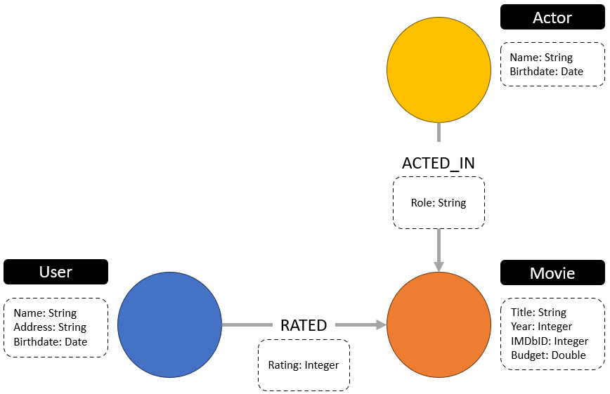 De drie componenten van een graph database zijn nodes, bogen en properties. Deze eigenschappen kunnen ofwel op de nodes, ofwel op de bogen, ofwel op beide worden geplaatst. Laten we eens kijken naar het voorbeeld in Figuur 1, de node “Paul” kan bijvoorbeeld gelinkt worden met eigenschappen zoals zijn geboortedatum en adres, voor de nodes die films voorstellen kunnen we eigenschappen associëren zoals het jaar van uitgave, het budget en de IMDb identifier, en op de “RATED” relaties tussen een gebruiker en een film kunnen we eigenschappen associëren zoals de kijkdatum en de waardering (op 5) die de gebruiker aan de film geeft.