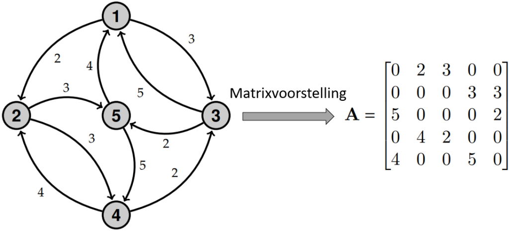 Hier gaat een boog van gewicht 3 van node 1 naar node 3 en een boog van gewicht 5 in de tegenovergestelde richting. De matrix A bevat daarom de waarde 3 op positie (1,3) en de waarde 5 op positie (3,1).