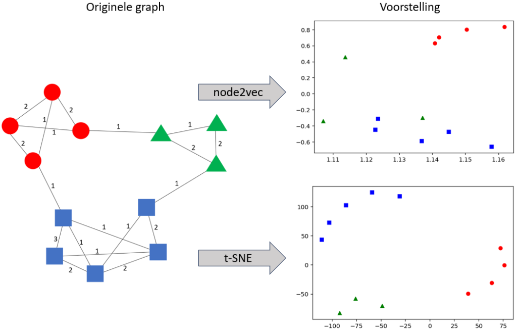 De traditionele modellen voor machine learning hebben als limiet dat ze alleen rekening houden met de gegevens (continue en categorische variabelen) die betrekking hebben op de waarnemingen, en de informatie negeren die kan worden afgeleid uit de relaties tussen de waarnemingen. Indien er relaties bestaan tussen deze gegevens, kan er een graph worden geconstrueerd en kunnen de machine learning modellen worden verrijkt door nieuwe variabelen uit de graph toe te voegen (er is ook een blogpost over dit onderwerp [11]). Deze nieuwe variabelen kunnen bijvoorbeeld een maat voor centraliteit zijn (continue variabele) of het resultaat van partitionering (categorische variabele), of ze kunnen worden verkregen met behulp van ‘graph embedding’-methoden (continue variabelen). Graph embedding moet leiden tot een representatie van de nodes in een multidimensionale ruimte. Deze ruimte wordt zo berekend dat als twee nodes dicht bij elkaar liggen in de graph, ze ook dicht bij elkaar liggen in deze ruimte. Zo’n ruimte kan worden verkregen met methoden die direct op de graph werken (node2vec [19], fastRP [20]) of door te werken op basis van bijvoorbeeld similariteiten (kernelPCA [21]) of afstanden (t-SNE [22]). Zie figuur 3 voor een voorbeeld van een tweedimensionale weergave van een eenvoudige gewogen graph.