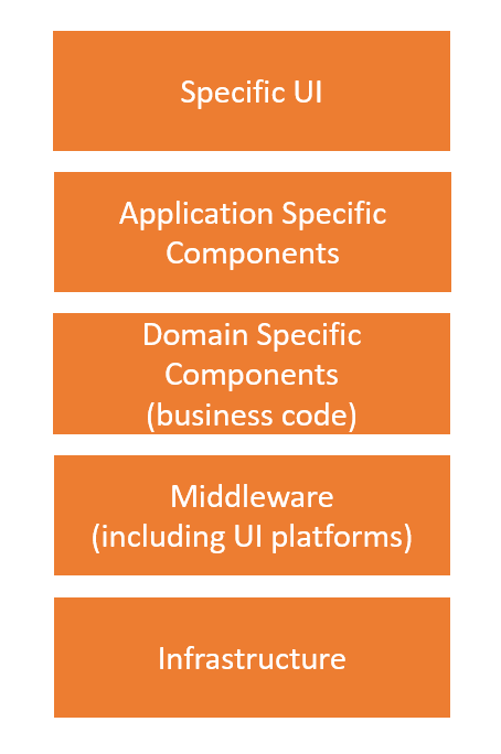 In grote lijnen de “Functionele Stack”: hoger liggende componenten maken hier typisch enkel gebruik van lager liggende zaken. Hoe lager iets ligt, des te vaker het kandidaat is voor hergebruik.
