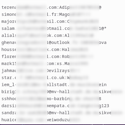 • lijsten met “inloggegevens”: gebruikersnaam + wachtwoord, soms met de betreffende website. Waarschijnlijk verkregen door phishing of door een “keylogger”, moeilijk te controleren (zonder ze te hebben getest, wat we natuurlijk nooit hebben gedaan) of de data nog actueel zijn. Maar met miljoenen gegevens is het aannemelijk dat er altijd wel functionele toegangen te vinden zijn.