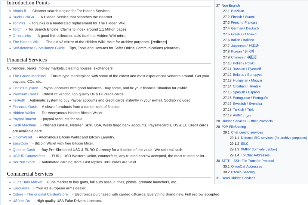 • gebruik maken van een “hidden wiki”, een directory met links die op categorie zijn gerangschikt. Er zijn er een aantal, sommige op het Clear Web, die gemakkelijk te vinden zijn door met een klassieke zoekmachine op “hidden wiki” te zoeken. Je moet er echter rekening mee houden dat een groot deel van de links niet meer werkt;
