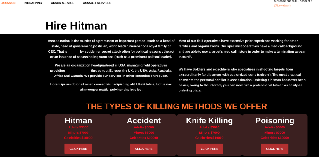 • aanslagen op personen: er zijn tal van “diensten” beschikbaar: moord, ontvoering, agressie. Sommigen zijn echter van mening dat het hier slechts om pogingen tot afpersing gaat.