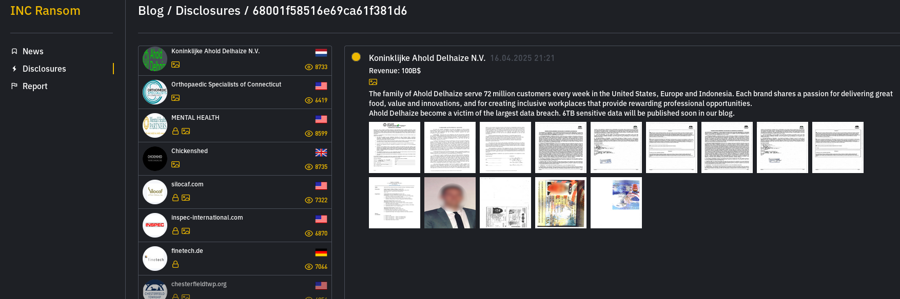 • Resultaten van ransomware. Wanneer hackers erin slagen om in te breken in het systeem van een bedrijf, versleutelen ze vaak alle data en eisen ze losgeld om ze weer toegankelijk te maken. En als het losgeld niet wordt betaald, publiceren veel groepen de gestolen inhoud in zijn geheel. Een aantal websites biedt “bewijsmateriaal” (meestal screenshots van enkele documenten; zie hieronder voor de hack van de Ahold Delhaize-groep door de INC Ransom-groep) voor “lopende” onderhandelingen en toegang tot grote volumes voor verlopen onderhandelingen.
