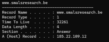 (Gedeeltelijk) resultaat van het Windows-commando ‘ipconfig /displaydns’ na het bezoeken van https://old.smalsresearch.be in de incognitomodus.