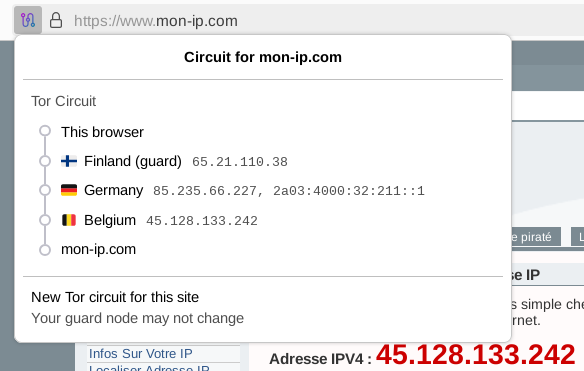 Circuit weergegeven in de Tor-browser, met de drie knooppunten, bij een bezoek aan mon-ip.com. We zien dat het zichtbare IP-adres van de bezochte site dat van het uitgangsknooppunt is