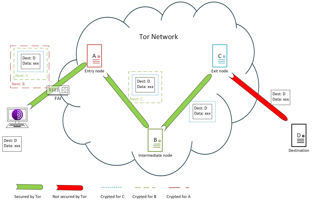 We richten ons hier alleen op wat de tool te bieden heeft op het gebied van gebruikersbescherming. Het basisprincipe van het Tor-netwerk (The Onion Router) is dat elk bericht, voordat het zijn bestemming bereikt, via drie tussenliggende knooppunten (Tor-knooppunten) wordt verzonden, die willekeurig worden gekozen uit een lijst van vrijwillige servers: een ingangsknooppunt A, een tussenliggend knooppunt B en een uitgangsknooppunt C. De Tor-client “verpakt” (versleutelt) eerst zijn bericht met de privésleutel van C (inclusief het IP-adres van de bestemming D), voegt vervolgens een laag toe (zoals een ui, vandaar de naam) door te versleutelen met de sleutel van B, en ten slotte met de sleutel van A.
