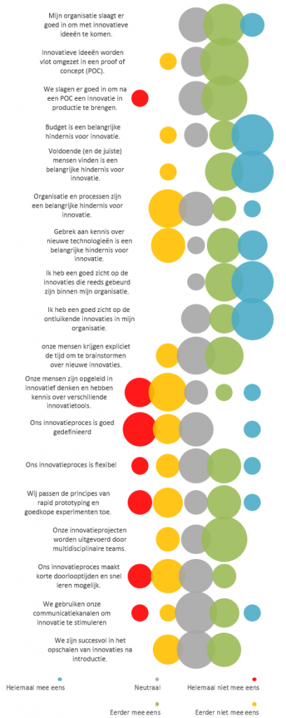 Wanneer we wat dieper gaan kijken dan strategie, en overschakelen op innovatie in de praktijk, zien we een pak meer gemiddelde en zelfs negatieve scores. Kijken we in Figuur 2 naar het vervolg van de enquête. Het blijkt dat ideeën hier en daar nog wel worden gegenereerd, maar deze leiden niet altijd tot een Proof Of Concept (POC) en nog minder vaak gaat men in productie met een innovatie. Budget en voldoende mensen vinden, zijn daarbij de grootste obstakels. Positief is wel dat de bevraagden (meestal degenen verantwoordelijk voor innovatie) over het algemeen wel een goed zicht hebben op hun organisatie. Maar spijtig genoeg zien we in deze grafiek toch een pak meer rood en minder blauw dan in de vorige grafiek.