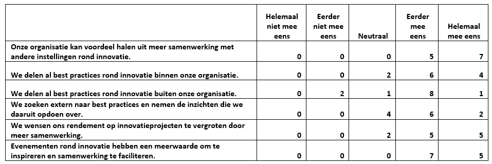 Vervolgens (zie figuur 3) peilden we ook naar de wens tot verbetering en samenwerking rond innovatie. Het resultaat daarvan is duidelijk positief: niemand staat neutraal of negatief tegenover samenwerking met andere instellingen of deelname aan evenementen rond innovatie. Ook blijkt men meestal al enige ervaring te hebben met het delen van en zoeken naar best practices rond innovatie.