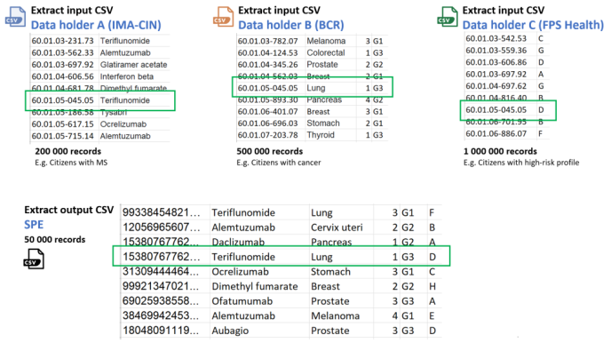 L’illustration 3 présente un exemple fictif de tels fichiers CSV. En haut figurent des extraits de fichiers CSV que les détenteurs de données (trois dans le cas présent) fournissent chacun en entrée à leur client LetheLink. Au bas de l’illustration, un extrait du fichier CSV généré en sortie par le client du collecteur de données à la suite de l’exécution du protocole est présenté. Dans notre exemple fictif, le chercheur s’intéresse uniquement aux données transversales, c’est-à-dire aux données relatives aux 50 000 patients atteints de SEP qui ont reçu un diagnostic de cancer et présentent un profil de risque élevé. La personne dont le numéro de registre national est 60.01.05-045.05 appartient à ce groupe. Le collecteur de données voit les informations combinées sur ce citoyen, non pas sous ce numéro de registre national, mais sous le pseudonyme “153807…”.