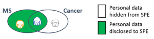 Illustration 1 : à gauche, l’ensemble des patients atteints de SEP, à droite, l’ensemble des citoyens ayant reçu un diagnostic de cancer. Seules les données relatives aux citoyens des deux régions vertes peuvent être divulguées sous forme pseudonymisée à l’environnement sécurisé.
