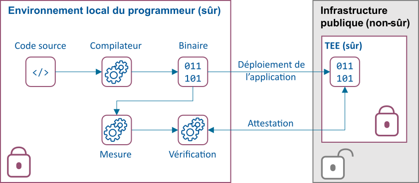 L’attestation est un élément fondamental pour vérifier la fiabilité d’un TEE et ensuite décider de lui faire confiance ou pas. Il permet à un environnement logiciel de prouver qu’un programme spécifique est exécuté par un matériel spécifique. Une attestation locale peut être utilisée entre deux environnements logiciels partageant le même matériel, mais ce qui intéresse la plupart des utilisateurs de systèmes avec TEE, est l’attestation à distance où les deux environnements logiciels fonctionnent sur du matériel différent.