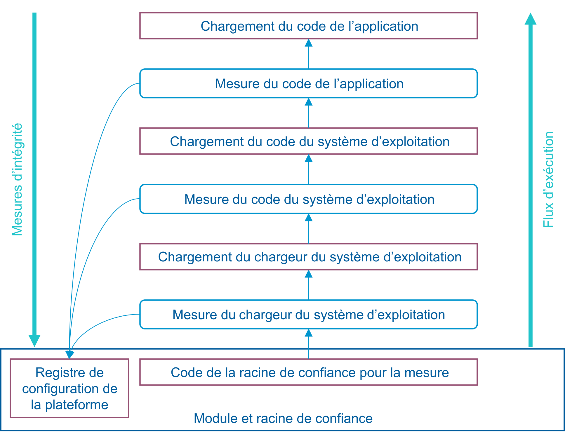 Ce mécanisme de chaîne de confiance résumé dans la Figure 2 fournit une vue fiable de l’état actuel du système. Toute bibliothèque, module, application, partie du système d’exploitation ou non, a une mesure d’intégrité stockée dans un stockage matériel sécurisé. En principe ces mesures sont signées afin d’empêcher les attaques par relecture ou par l’homme du milieu (par ex. [21]).