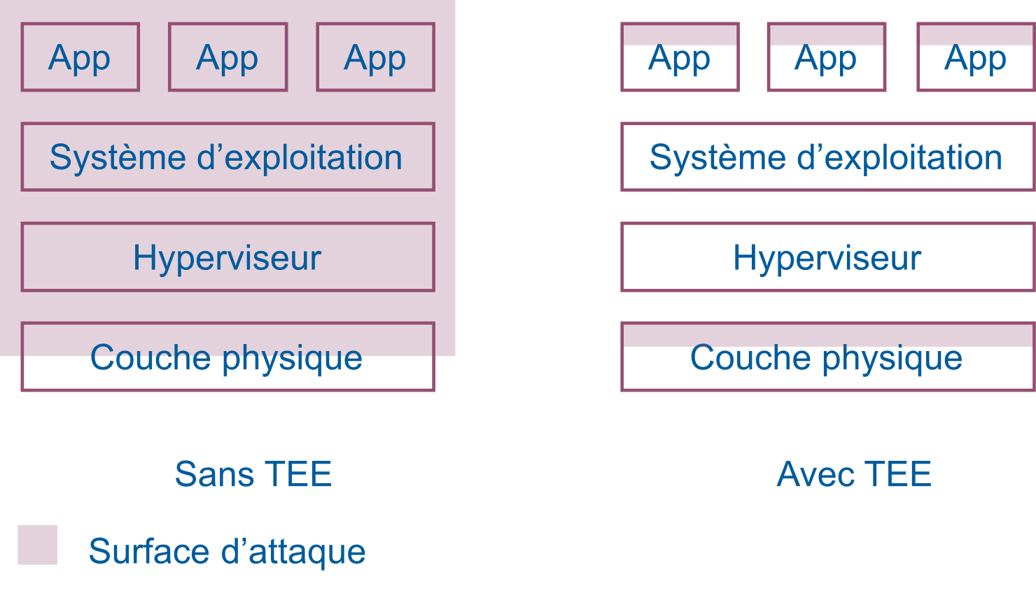 C’est sur cet argument que se basent les TEE qui visent à protéger l’exécution du code des applications contre les attaques de code privilégié et certaines attaques physiques en réduisant la base d’information de confiance et la surface d’exposition aux attaques (Figure 1).