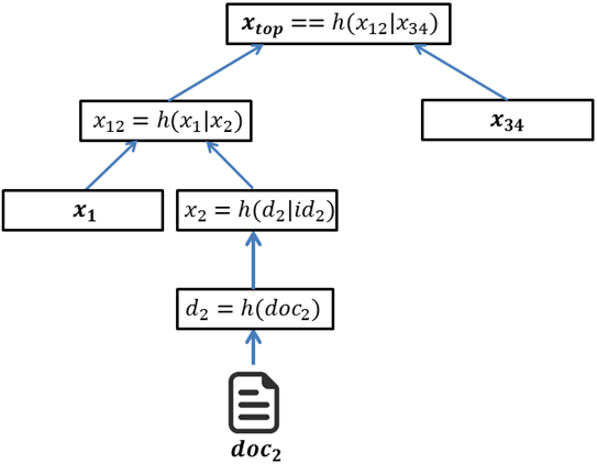 Een verifieerder van doc2 doet nu het volgende. A.d.h.v. de timestamp vraagt hij de correcte xtop op bij de KSI. Hij berekent, zoals geïllustreerd in figuur 3, d2=h(doc2), x2=h(d2|id2), x12=h(x1|x2) en verifieert of xtop==h(x12|x34). Indien de timestamp, de identifier of het document fout of gewijzigd zijn, zal dit niet het geval zijn, gezien dit resulteert in andere hashwaarden. Authenticiteit, integriteit en onweerlegbaarheid worden zo gegarandeerd.