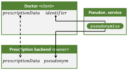 L’illustration 1 expose le flux de base: le médecin demande au service de pseudonymisation de convertir un identifiant en pseudonyme. Le médecin envoie ensuite le pseudonyme avec les données de l’ordonnance au service internet de prescription, qui stocke les données de la prescription sous ce pseudonyme.