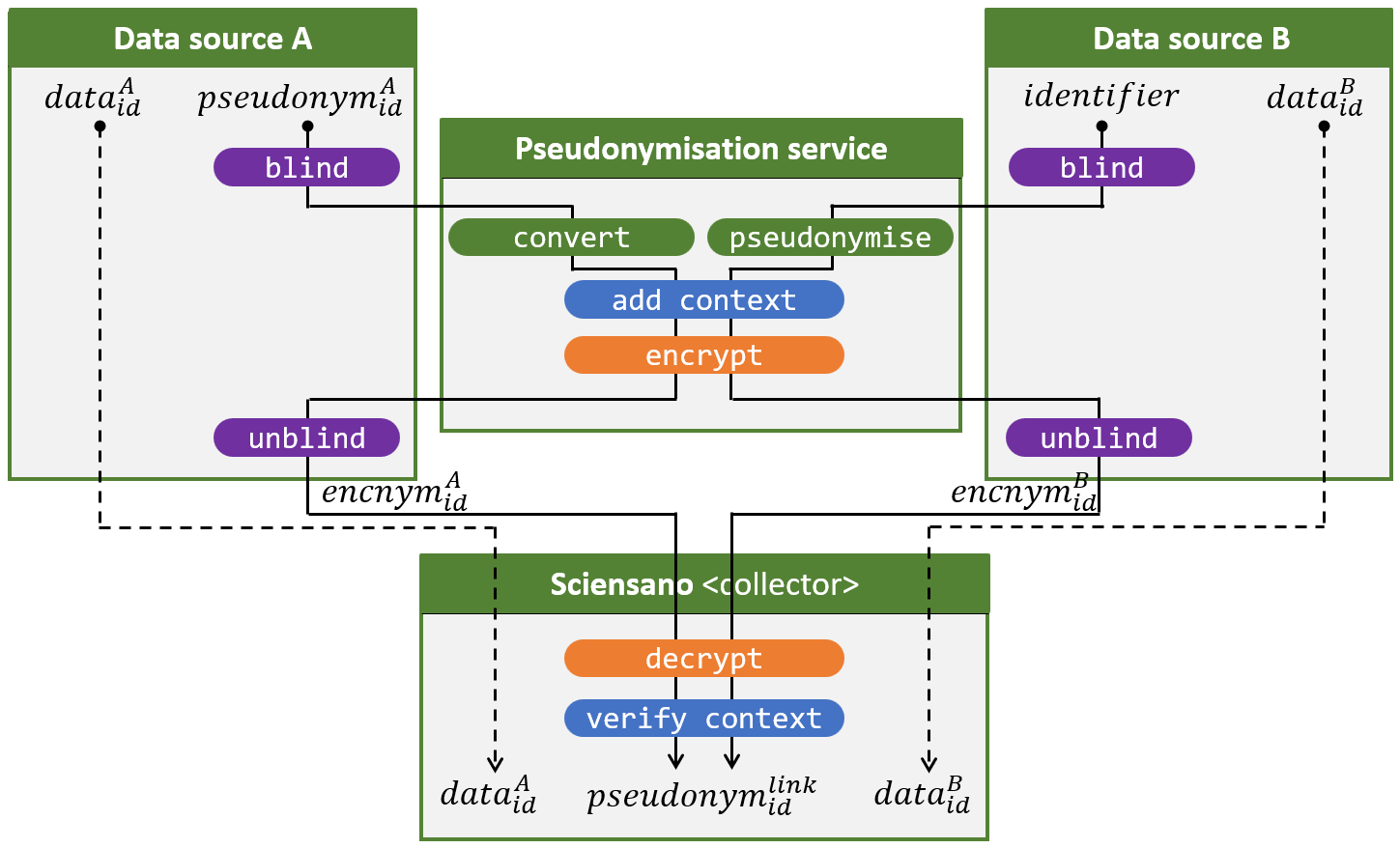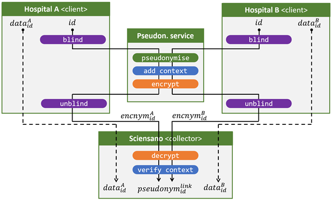 - Nous pouvons traiter de manière particulièrement élégante les situations dans lesquelles une ou plusieurs sources de données utilisent déjà le service de pseudonymisation à l’aveugle.