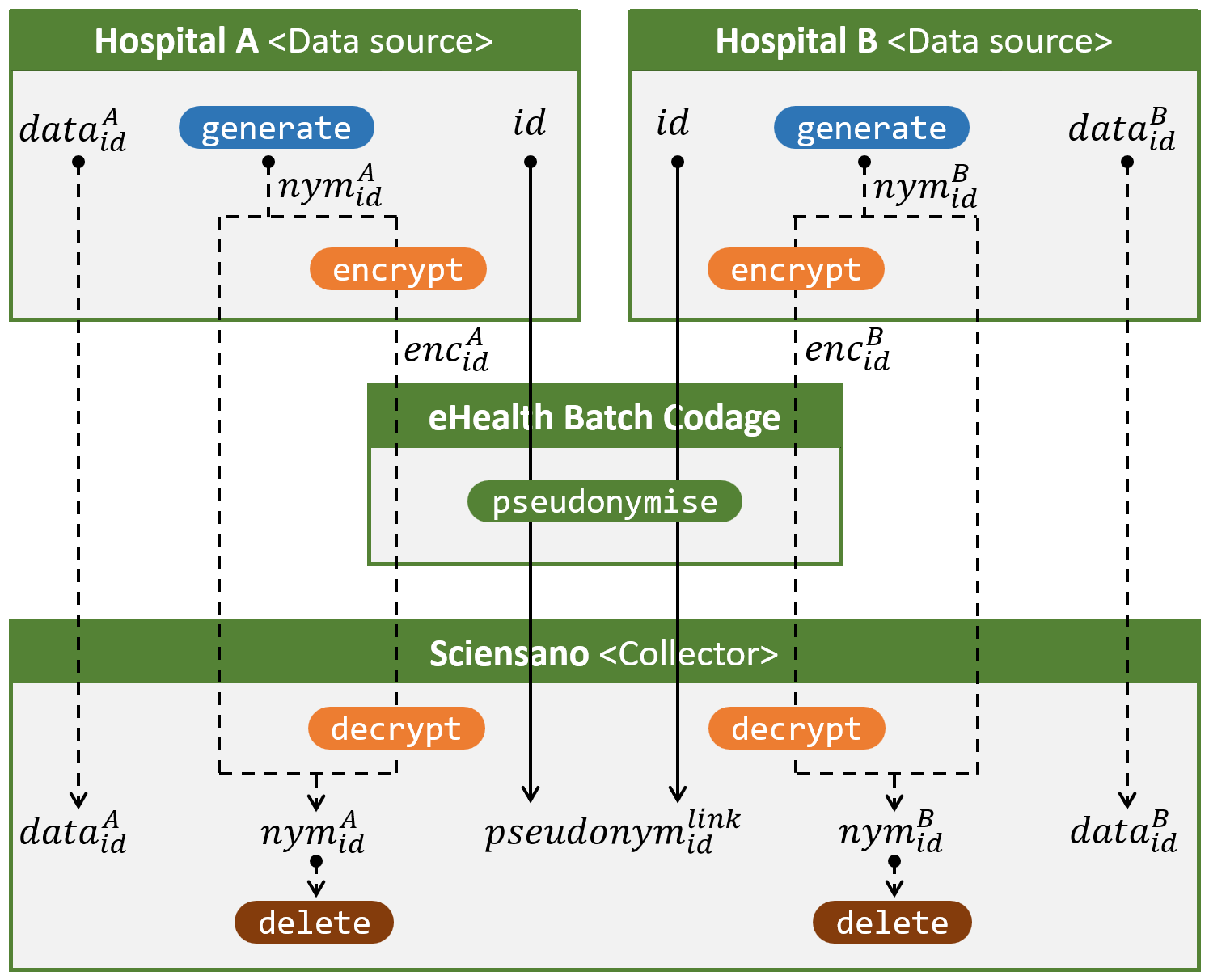 Pour chaque citoyen concerné, les hôpitaux envoient les données demandées directement à Sciensano et le numéro de registre national à eHealth Batch Codage. Ce dernier convertit le numéro de registre national en un pseudonyme spécifique au projet, le pseudonymlinkid, et envoie ce pseudonyme à Sciensano. Sciensano reçoit donc les données provenant d’un hôpital par un canal et les pseudonymes provenant de Batch Codage par un autre canal. Grâce à un pseudonyme de transit temporaire (par exemple nymAid), qui est caché à Batch Codage, Sciensano est en mesure de relier les données aux pseudonymes spécifiques au projet. Enfin, grâce à ces pseudonymes spécifiques au projet, Sciensano peut relier des données concernant le même citoyen mais provenant de sources différentes.
