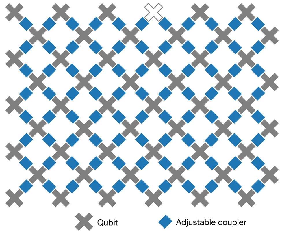 Dit zijn maar drie van de uitdagingen. De huidige generatie kwantumcomputers op basis van supergeleidende circuits, zoals die van IBM en Google, hebben nog andere ernstige beperkingen. Bij een klassieke computer kun je bijvoorbeeld berekeningen doen op twee (of meer) waardes in het RAM geheugen, onafhankelijk van hun relatieve posities in het RAM geheugen. Ze hoeven dus niet aangrenzend te zijn. Kwantumcomputers op basis van supergeleidende circuits laten enkel operaties (door middel van poorten) toe op qubits die aan elkaar grenzen. Zoals onderstaande figuur toont, grenst een qubit in de Sycamore machine ten hoogste aan 4 andere qubits.