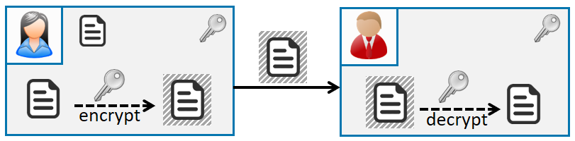 Bij symmetrische encryptie gebeurt encryptie en decryptie met dezelfde sleutel (zie onderstaande figuur). AES (Advanced Encryption Standard) is vandaag de wereldwijde standaard, die ongeveer 20 jaar geleden ontwikkeld werd door de KU Leuven. Vandaag biedt een AES-sleutel die 256 bits lang is (AES-256) een veiligheid van 256 bits, wat wil zeggen dat er 2256 ≈ 1077 (een 1 gevolgd door 77 nullen) mogelijke sleutels zijn. De efficiëntste aanval doet niet veel beter dan het één na één testen van alle mogelijke sleutels, tot de juiste gevonden is. Doordat de zoekruimte zo enorm groot is, is dit gewoon onbegonnen werk en zijn de kansen op succes verwaarloosbaar.