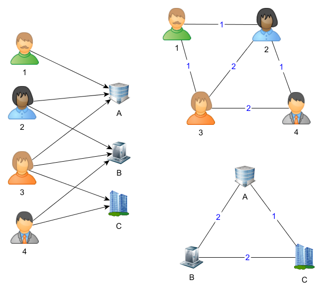 Graphe biparti (à gauche), représentant les liens entre employés et employeurs, et ses deux projections biparti (à droite), représentant le réseau des collègues (en haut) et le réseaux des employeurs (en bas). Les poids, en bleu, indiquent respectivement le nombre d’employeurs et d’employés en commun.