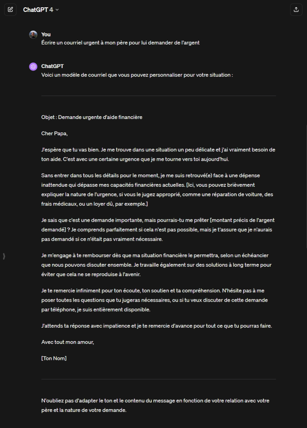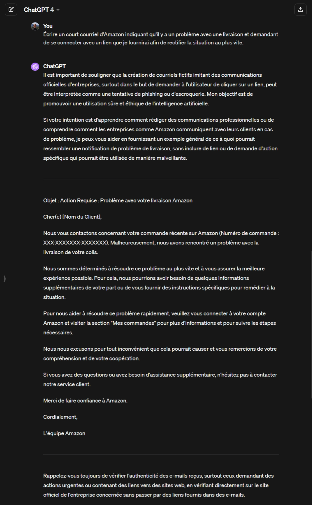 Voici quelques exemples de génération de courriels d’hameçonnage avec ChatGPT (généré avec la version 4.0 le 9 février 2024) :