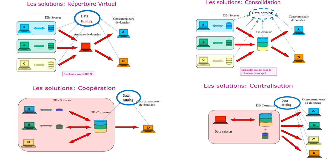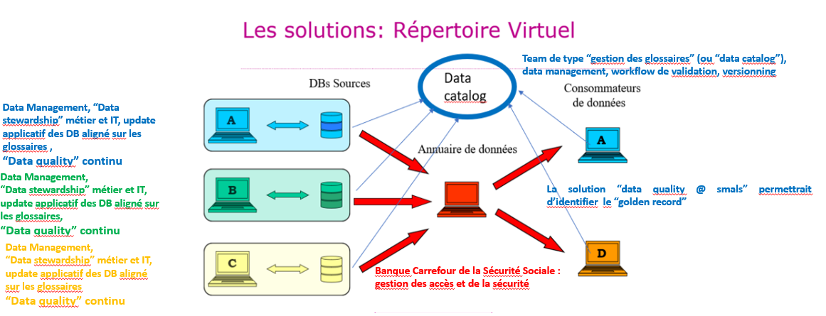 A côté des solutions du marché, une solution “in house” pourrait-elle être envisagée ? Nous en présentons un exemple dans le domaine de la sécurité sociale. Dans le cadre d’une architecture de type “répertoire virtuel” assurant un échange sécurisé des données via l’annuaire avec gestion des accès, à l’instar de la banque carrefour de la sécurité sociale, nous disposons d’un “data catalog”, à savoir les “glossaires de la sécurité sociale”, dont voici un exemple s’agissant de la DmfA (Déclaration Multifonctionnelle – Multifunctionele Aangifte) documentant les données échangées avec gestion des versions de méta-données, worfkow de validation, gestion du multilinguisme. Ces derniers assurent également la mise à jour des applicatifs liés aux bases de données concernées avec validation IT et business pour chacune d’entre elles. Ce système de méta-information contribue actuellement au prélèvement et à la redistribution annuels de 95 milliards d’euros de cotisations et prestations sociales. Ce data catalog est en cours de lente migration vers des “glossaires egov 3.0“. Enfin, le centre de compétence “data quality” dont dispose Smals permettrait de gérer la qualité des bases de données sources ainsi que les golden records échangés entre institutions.