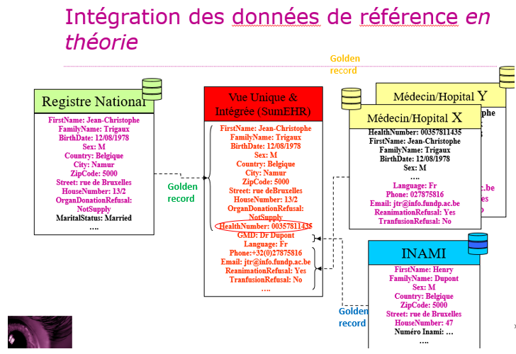 On trouve toutefois dans ce domaine des applications spécifiques sécurisées nécessitant une intégration des données, par exemple, le SumEHR (Summarized Electronic Health Record ou “dossier du patient”) dont voici une présentation schématique (JC Trigaux, 2009) avec l’échange de golden records et la génération d’un identifiant unique au sein de l’application SumEHR.