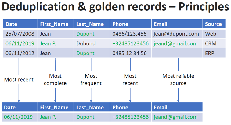 Een ‘data quality’-aanpak stroomopwaarts en stroomafwaarts van de uitwisselingsarchitectuur is eveneens essentieel om de kwaliteit van de ‘brondatabases’ te waarborgen, maar ook om de door de business gevalideerde ‘golden records’ te identificeren. De ‘golden records’ worden uitgewisseld om de traceerbaarheid van de Master Data (‘data lineage’) tussen databases te garanderen. De volgende figuur illustreert de toepassing van regels (vastgesteld door de business) om een golden record te identificeren per type cluster van vermoedelijke duplicaten (geïdentificeerd via een ‘matching’-procedure).