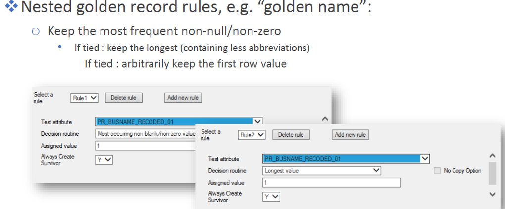 Op basis hiervan is het mogelijk om deze regels binnen enkele uren toe te passen op miljoenen records die vermoedelijke duplicaten bevatten, via performance management (de geschiedenis van de ‘niet-geselecteerde’ records wordt altijd bewaard voor het geval de eigenaars van de database de regels achteraf willen aanpassen). De volgende afbeelding toont een voorbeeld van het opstellen van een ‘golden record’ via de ‘data quality tool’ Trillium.