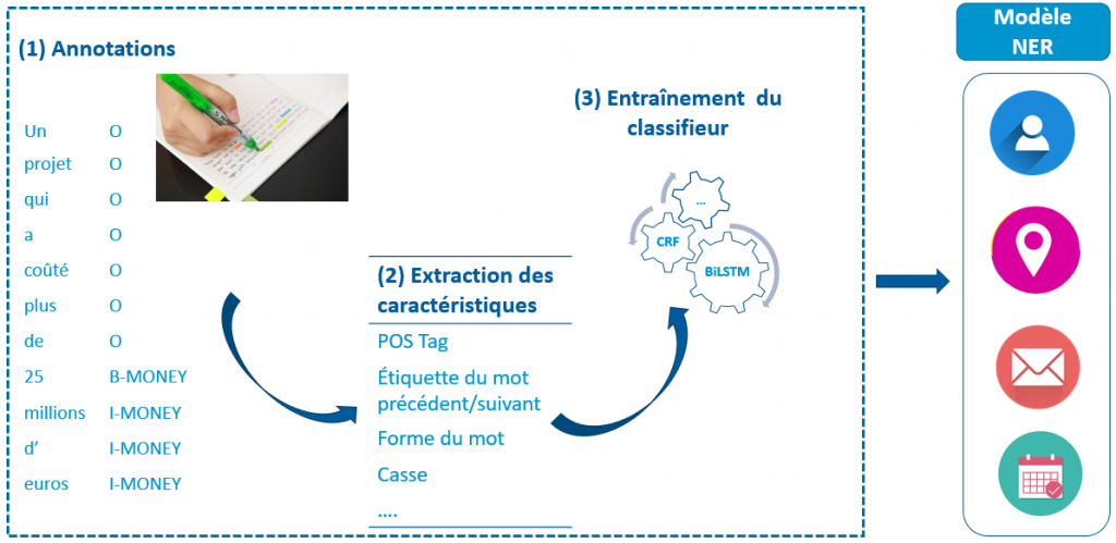 Le NER consiste à reconnaître des entités nommées (Named Entities) dans un corpus (ensemble de textes) et de leur attribuer une étiquette telle que “nom”, “lieu”, “date”, “email”, etc. Si le NER désigne au départ l’extraction de noms propres, de noms de lieux et de noms d’organisations, ce concept s’est étendu à d’autres entités telles que la date, l’email, le montant d’argent, etc. Dans bien des cas, il est utilisé pour extraire des termes propres à un domaine comme par exemple le numéro IBAN pour la gestion des paiements bancaires ou l’extraction de noms de gènes dans le domaine biomédicale.