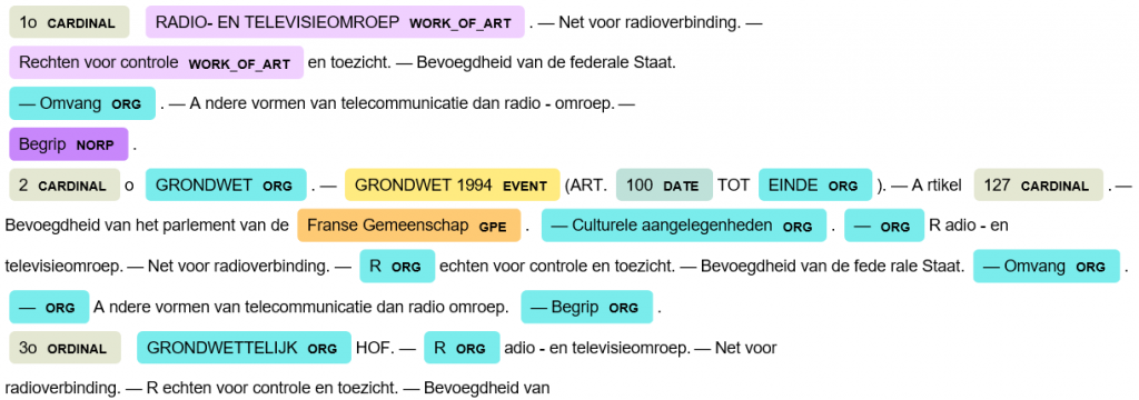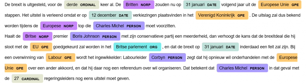 - La langue. Pour l’application d’un modèle statistique, la langue d’entraînement de l’algorithme est déterminante. Il existe des outils NLP qui permettent de faire de la reconnaissance d’entités « out of the box » néanmoins la plupart ces outils NER sont principalement développés pour l’anglais et peu ou pas pour le français et le néerlandais.