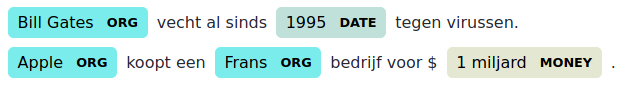 Een ingebouwde functionaliteit van hun taalmodellen is Named Entity Recognition (NER), het herkennen van entiteiten in een tekst. In de documentatie bij elk taalmodel zien we in het label scheme o.a. alle categorieën die het model kan herkennen: DATE, TIME, PERCENT etc., maar ook PERSON (eigennamen), PRODUCT of WORK_OF_ART. Het is gemakkelijk dit zelf uit te proberen op een klein stukje tekst, geïnspireerd op hun tutorial:
