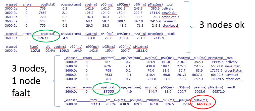 Figuur 3: Vergelijking van de testresultaten zonder en met node-falen voor CockroachDB. In groen is het totaal aantal transacties aangeduid. In rood de sterke vertraging van de traagste transactie bij node-falen.