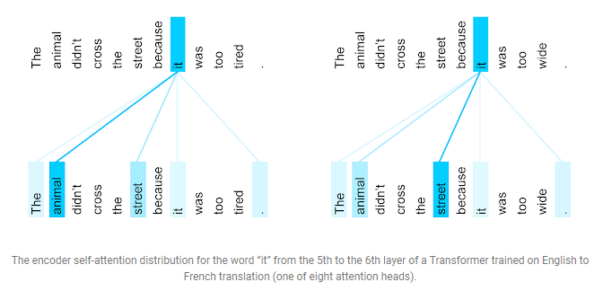 Visualisation des mécanismes d’attention à l’œuvre dans un cas de résolution de coréférence. Dans la première phrase à gauche le mot it se réfère au mot animal tandis que dans la phrase de droite ce même mot se réfère à street.