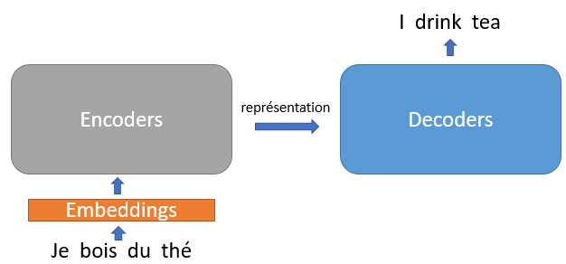 Dans le cas particulier de la traduction automatique, l’encodeur transforme le texte source en vecteur qui est ensuite donné en entrée au décodeur. Ce dernier génère alors la séquence correspondante dans la langue cible.