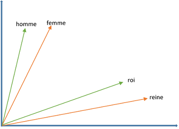 Exemple d’intégration des mots homme, femme, roi et reine dans un espace à deux dimensions. Les vecteurs représentant les mots homme et femme sont proches l’un de l’autre, de même pour les vecteurs représentant les mots roi et reine.
