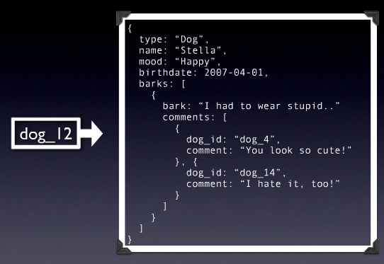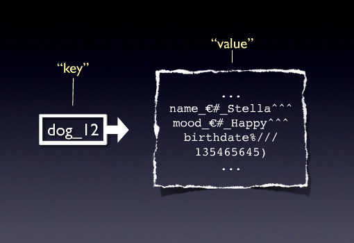 Een key-value store is niets meer dan een hash: een vlakke gestructureerde databank die bestaat uit een verzameling unieke paren van keys en bijhorende value. Door hun grote eenvoud zijn ze extreem snel & schaalbaar. De value is van het type “blob” en kan dus vanalles zijn. Voorbeelden: Amazon Dynamo, Voldemort,…