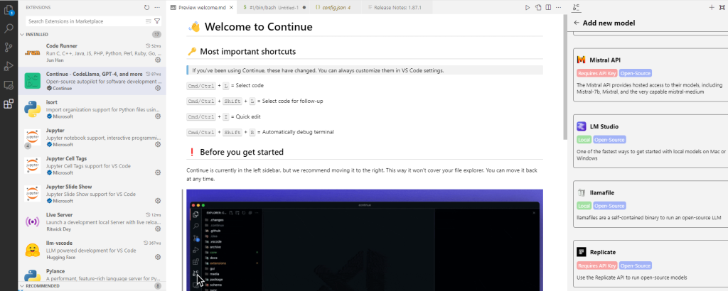 Onder de open-source alternatieven hoort Continue momenteel waarschijnlijk bij de top. Er zijn er andere – Huggingface zelf heeft bijvoorbeeld llm-vscode ontwikkeld – en ongetwijfeld zullen er nog bijkomen. Net zoals Github Copilot bestaat Continue ook als plugin voor VSCode of IntelliJ. Het kan zowel gebruikmaken van commerciële cloud-based generatoren (waaronder GPT-4) als van zelf gehoste open-source oplossingen. Die hoeven niet noodzakelijk de OpenAI API na te volgen, en er is veel customizatie mogelijk.