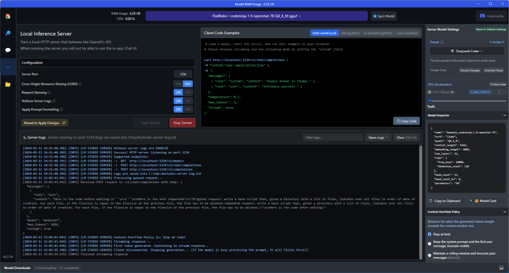 docker run -ti -p 1234:8080 localai/localai:v2.7.0-ffmpeg-core codellama-7b-gguf De opstart ervan duurt echter even, want het model wordt in de container gedownload. Interessanter is het om zelf een reeks modellen in een lokale map te bewaren, en daaromheen een API te zetten middels een LocalAI container. Ook voor die aanpak zijn relatief eenvoudige instructies beschikbaar. We kunnen ze bijvoorbeeld toepassen op de DeepSeek LLM van 6.7 miljard parameters, gekwantiseerd op 4 bits. Deze kan rechtstreeks van Huggingface gedownload worden naar de lokale map ./models-gguf met een wget commando van het type: