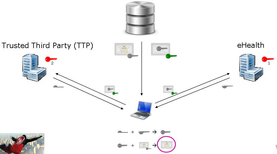 Merk dus op dat de gegevens enkel zichtbaar zijn bij de dokter en dat géén gegevens (zelfs niet vercijferd), door een van de externe partijen, vloeien. Het is op dit gebruik van threshold encryptie, dat een patent is genomen.