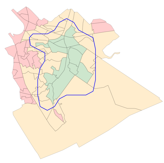 La moins restrictive (type ‘intersect’) inclut dans la jointure tous les secteurs statistiques ayant une partie de la surface en commun avec le polygone défini par la courbe isochrone, et inclut donc les secteurs verts et oranges.