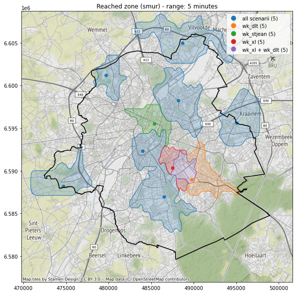On observe que les scénarios “Saint-Jean” et “Ixelles” sont à peine différentiables, quel que soit le délai. Cela ne signifie pas nécessairement que le même territoire est atteint, simplement que quasiment la même superficie l’est. Il se peut très bien par exemple qu’un quartier soit accessible en 5 minutes uniquement la semaine d’Ixelles, mais une autre zone de grosso-modo la même superficie sera alors uniquement accessible en 5 minutes la semaine de Saint-Jean.