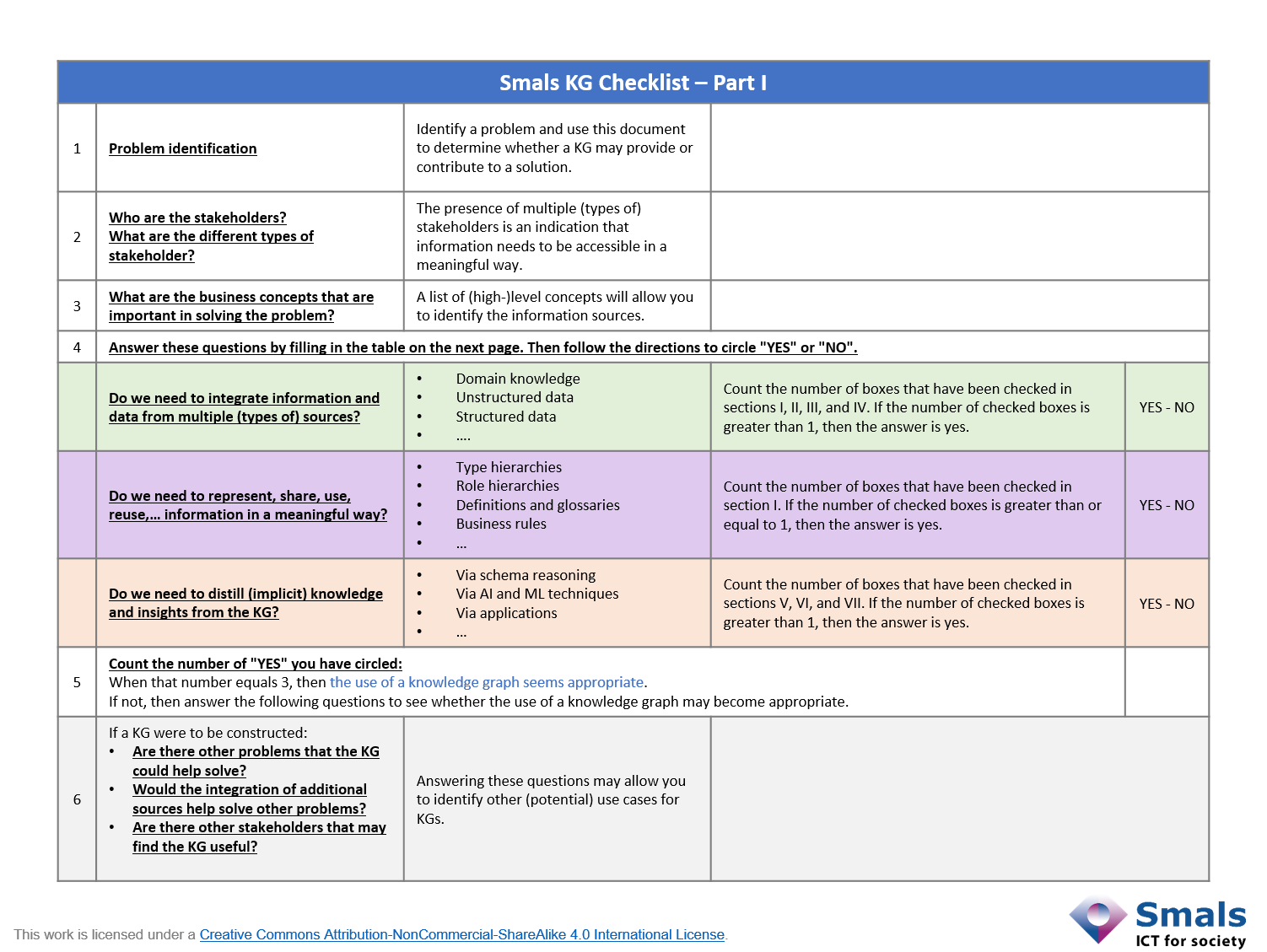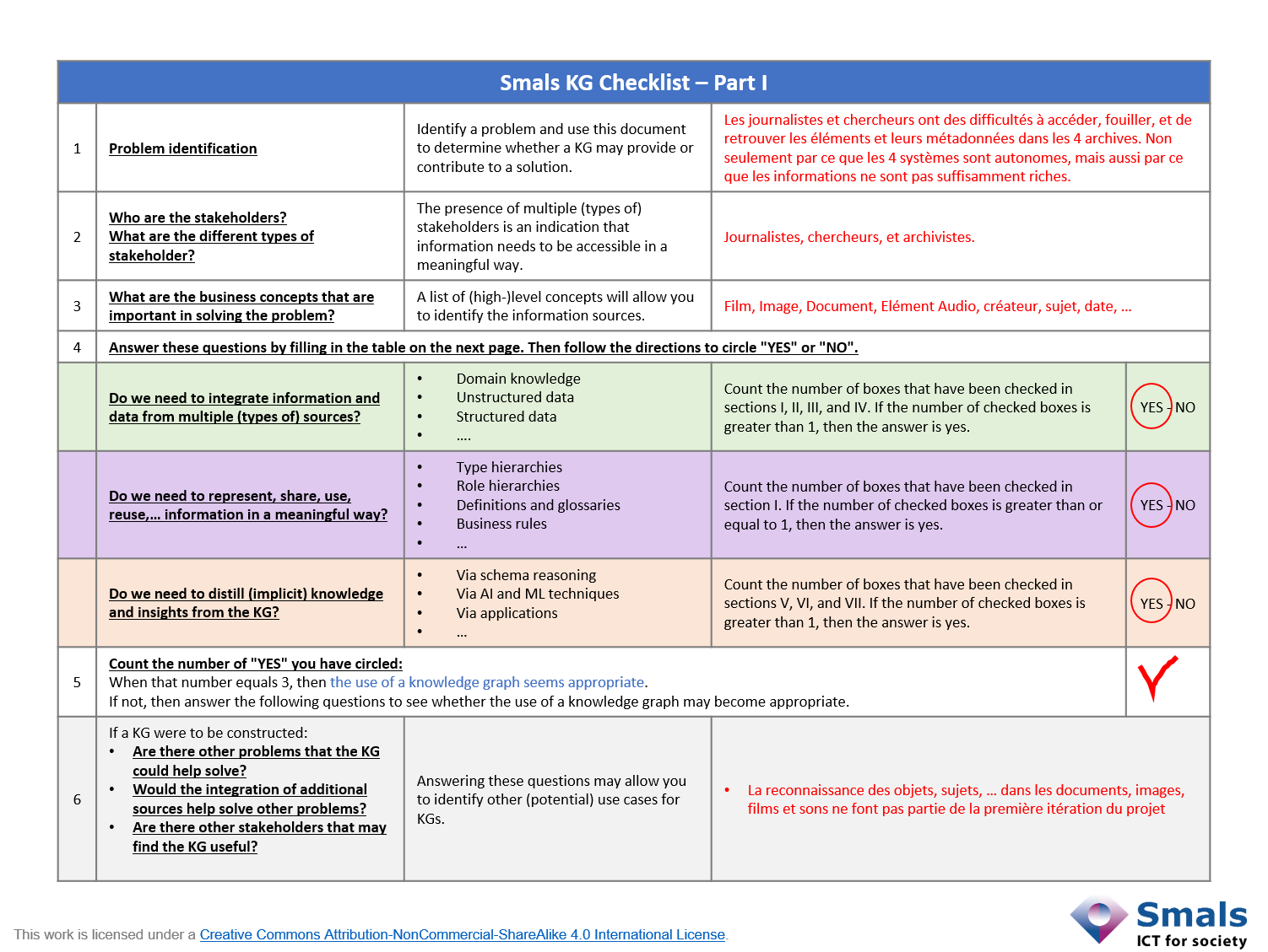 Une fois complété (voir affiné au fil du temps) et les trois conditions remplies, le Smals KG Checklist contient une description d’un projet de graphe de connaissances à haut niveau (avec le scope, les attentes, les applications, …). Cette checklist devient donc un document précieux pour les décisions GO/NO-GO, par exemple dans les phases de début des méthodologies Prince2.