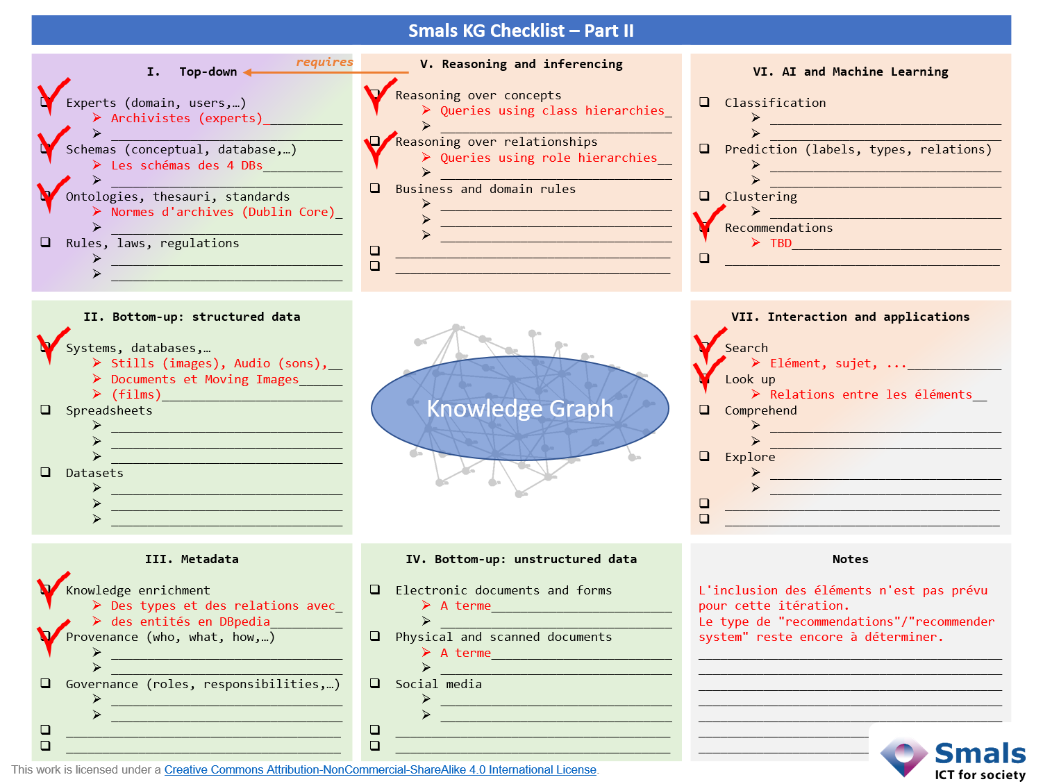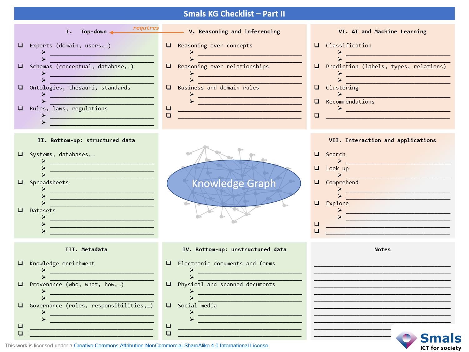 Le Smals KG Checklist est conçu pour être utilisé dans un contexte collaboratif, par exemple un workshop. Il est nécessaire qu’il y ait au moins une personne (p. ex., le modérateur) qui maitrise le sujet des graphes de connaissances et que cette personne remplisse le Smals KG Checklist pendant les discussions.